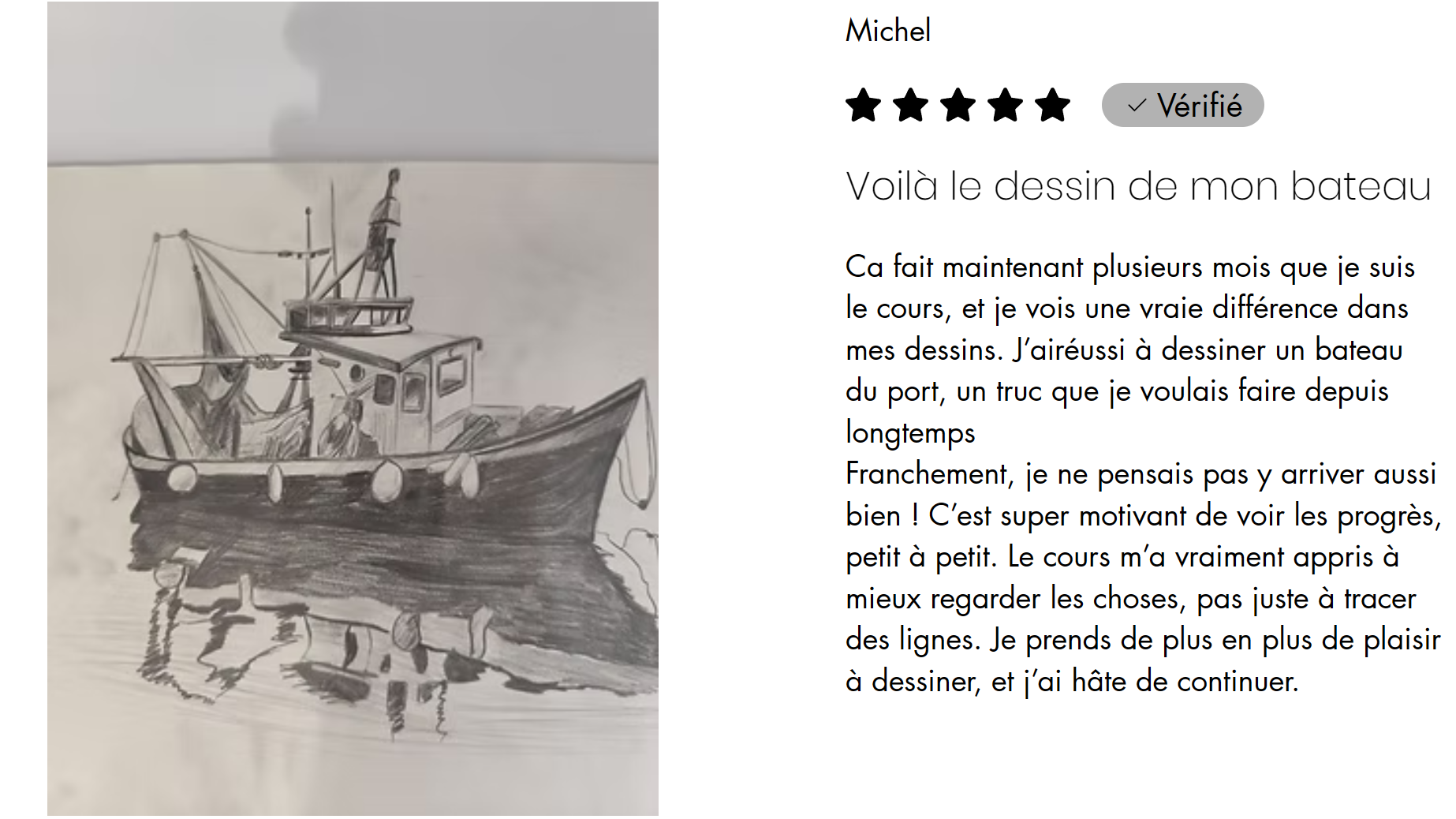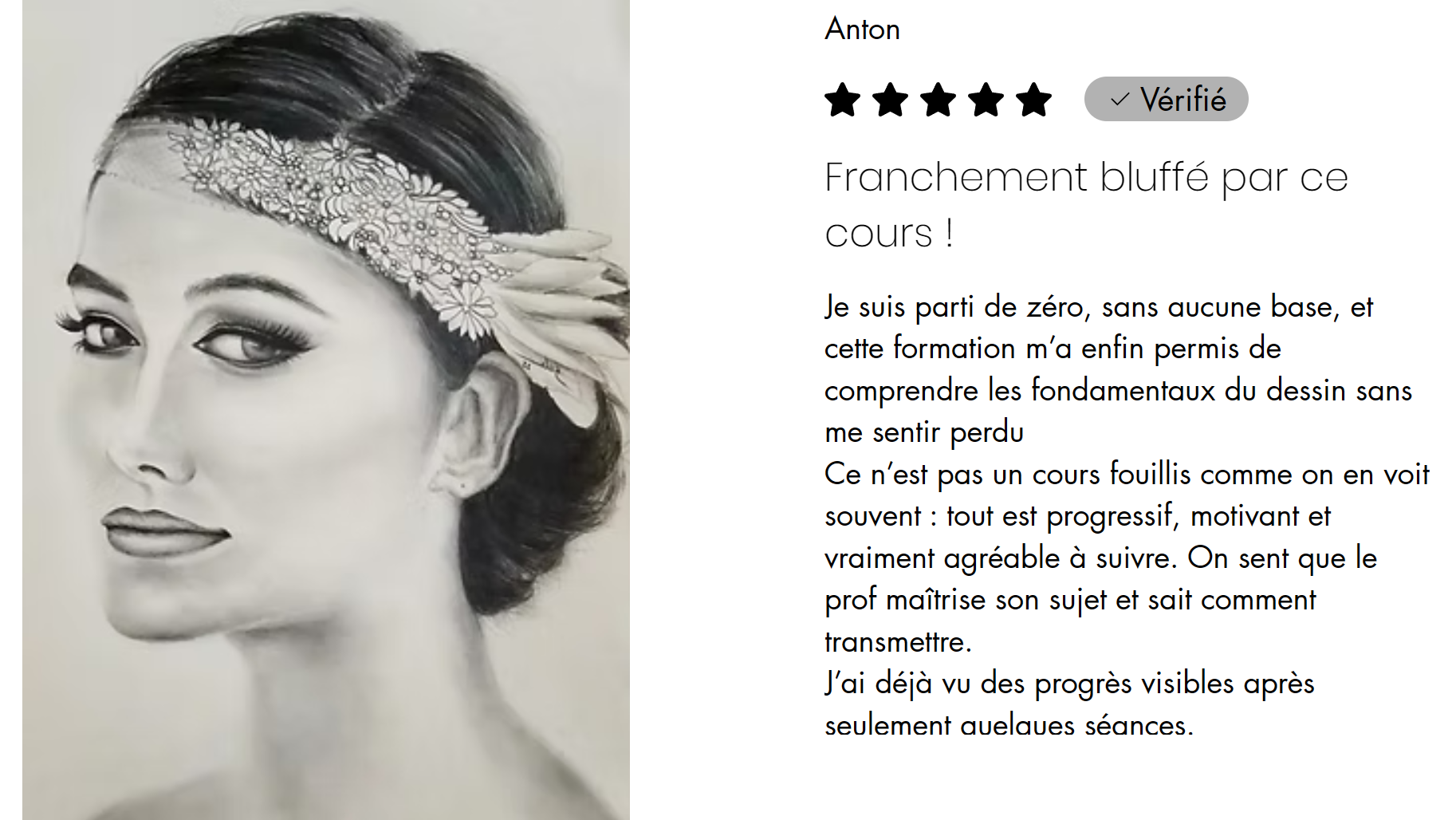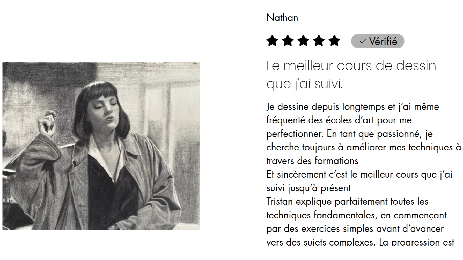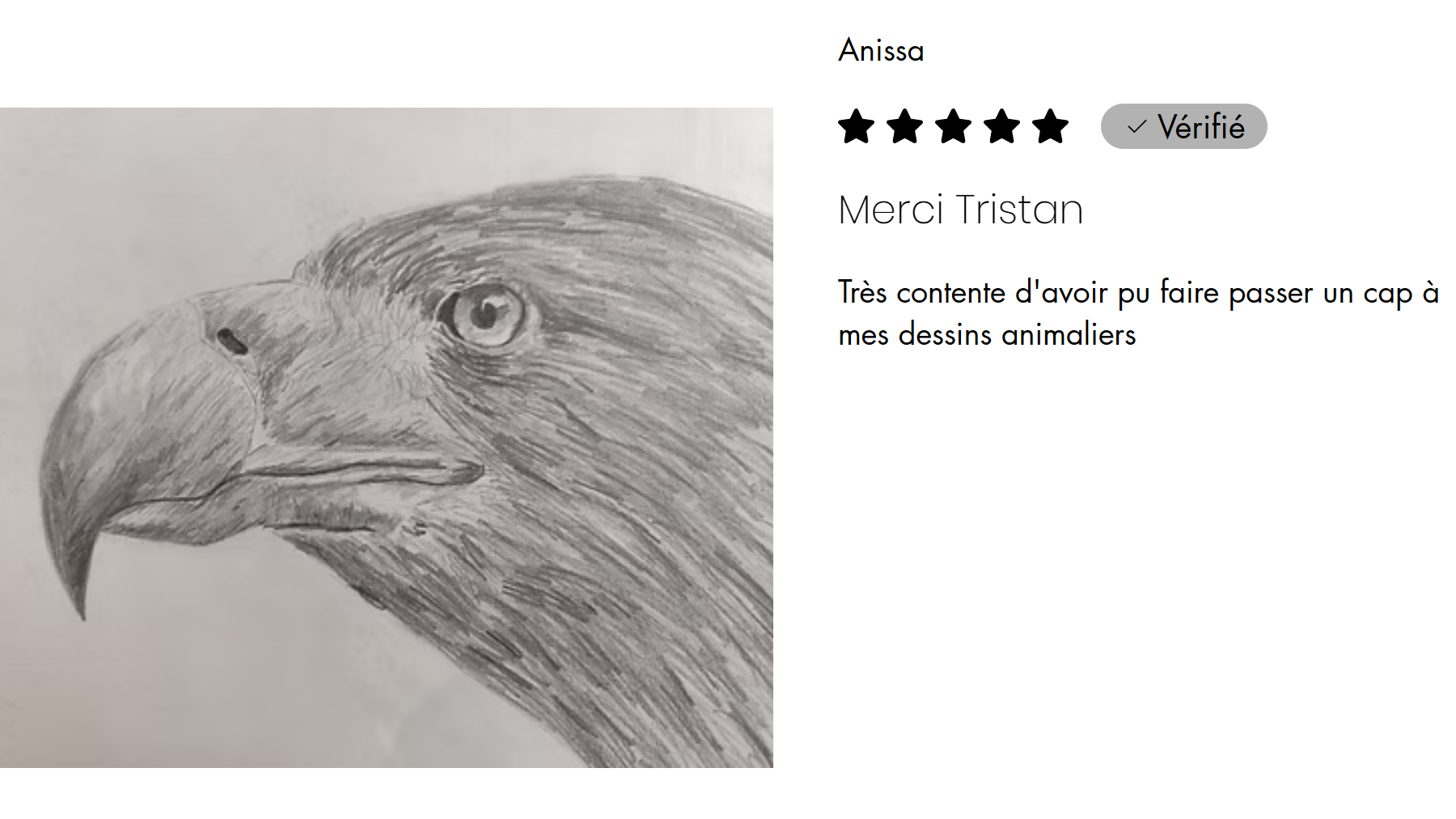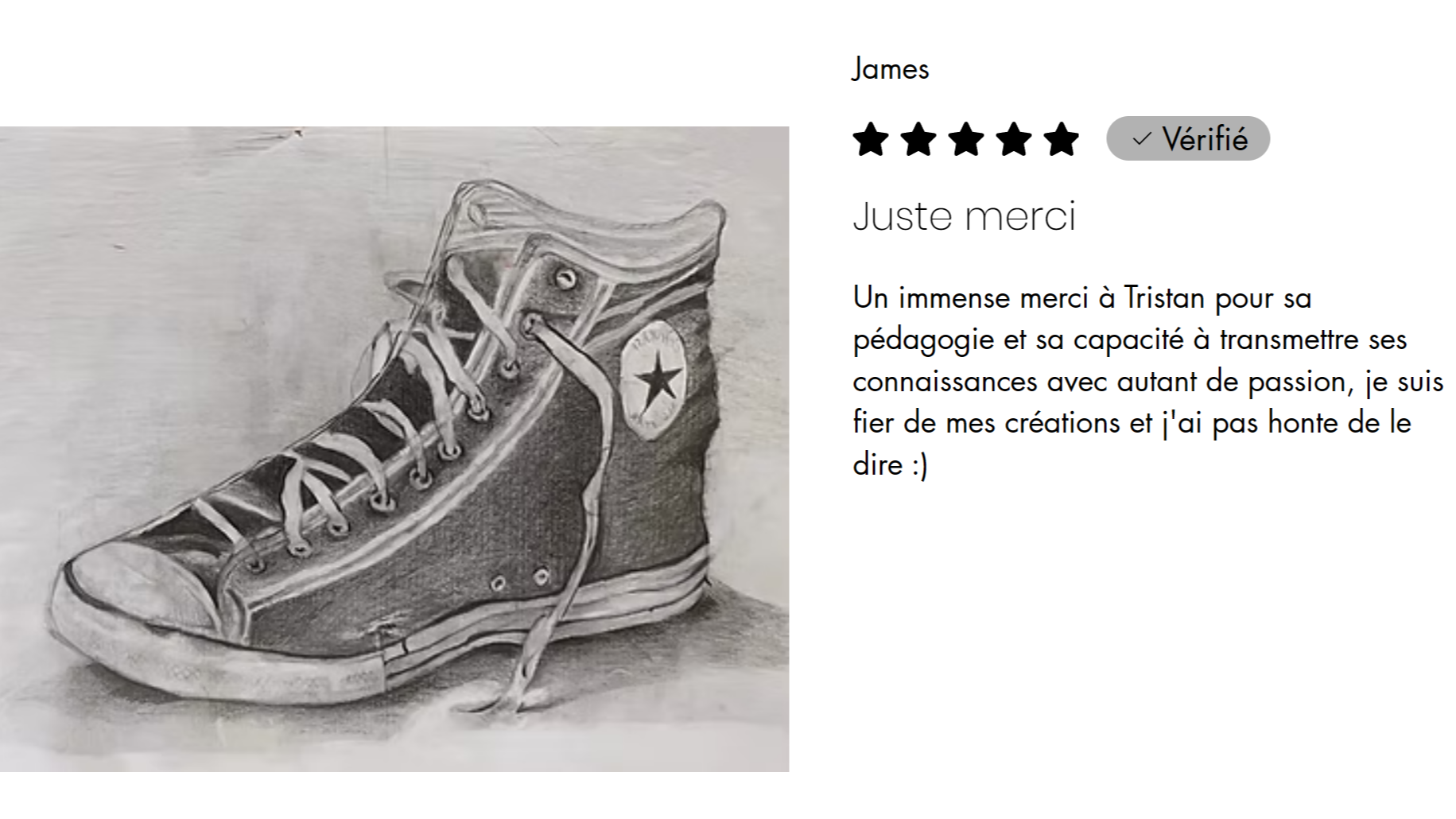 "Je pensais que le dessin était réservé à ceux qui avaient un don. Avec les cours de Tristan, j’ai compris que c’est surtout une question de méthode. Les explications sont claires, les exercices progressifs, et les résultats arrivent vite. Aujourd’hui, je prends enfin plaisir à dessiner."