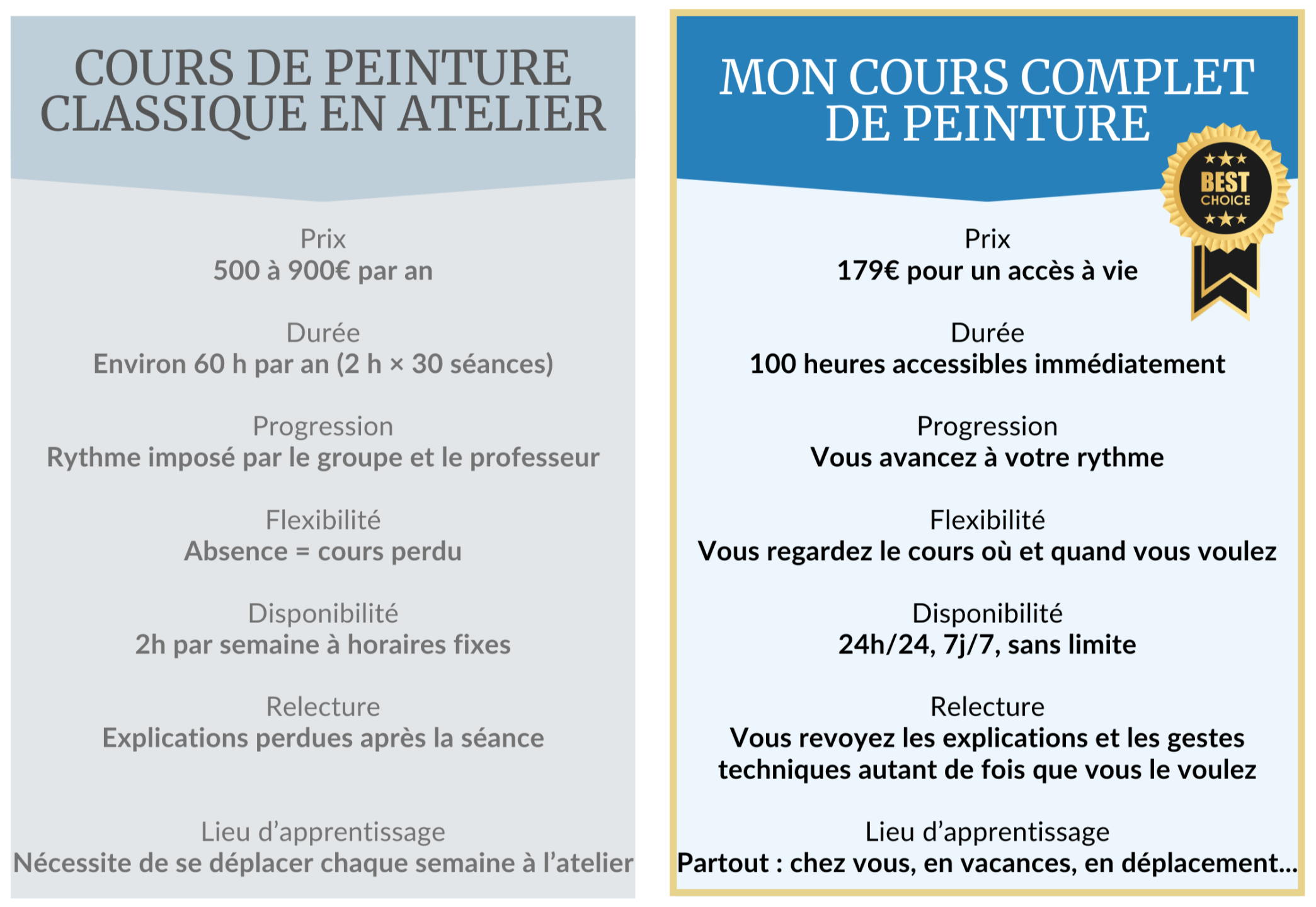 Le cours de peinture est pensé pour être suivi même sans bases en dessin. Vous pouvez donc commencer directement et progresser sans crainte.